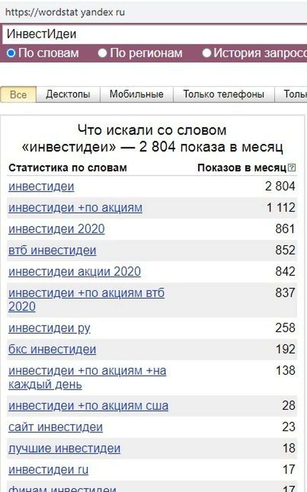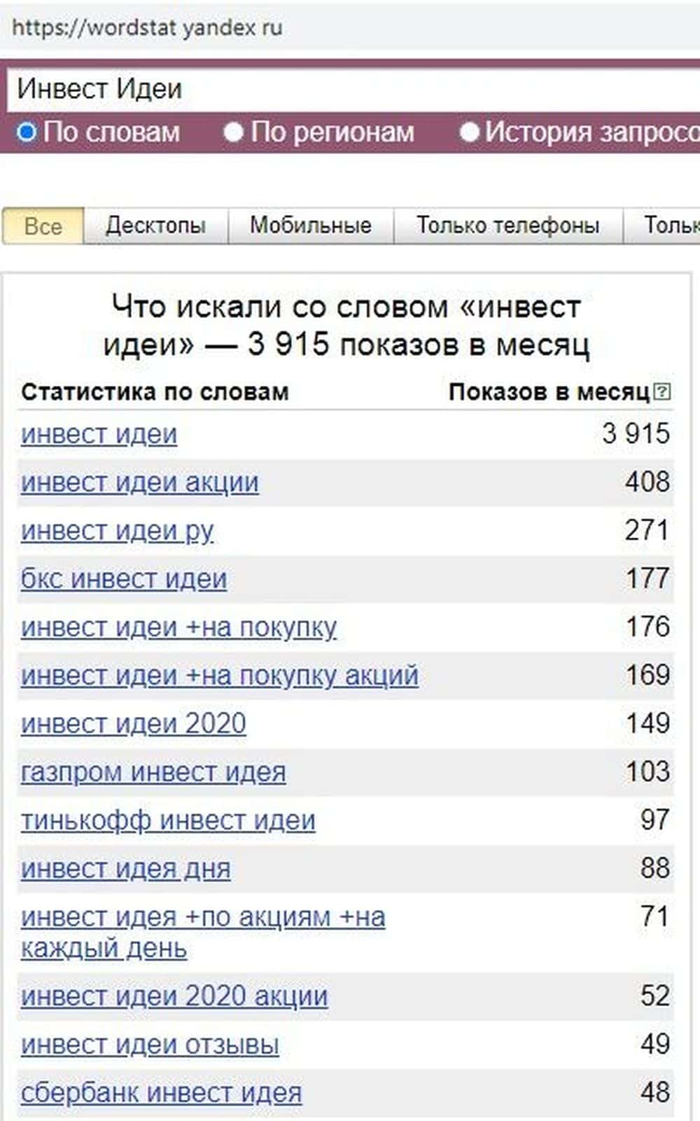 Шарлатаны Инвест Идеи на самом деле мало кого интересуют, но они выбрали удачное название для лохотрона, чтобы заманивать новичков. По запросу "Инвест Идеи" 3915 показов.