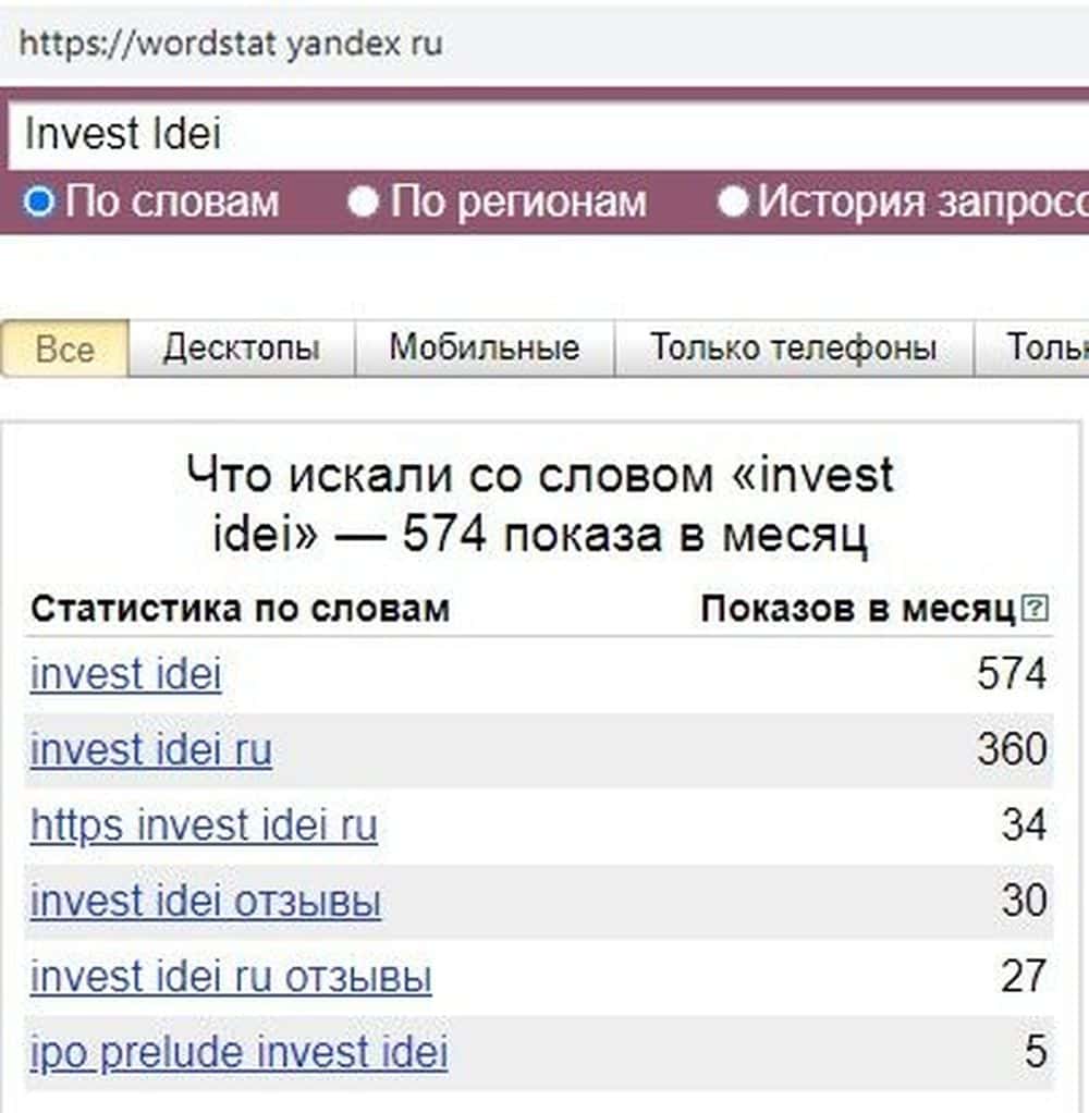 Запрос "Invest Idei" искали всего 574 раза за месяц, и это уже ближе к истинной статистике популярности лохотрона Инвест Идеи. Трейдеры пытаются в основном найти отзывы о шараге.