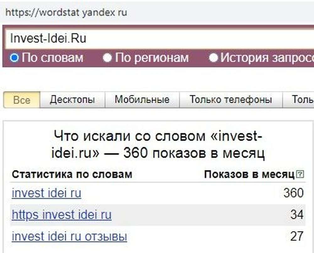 По запросу "ИнвестИдеи" показов меньше, 2804 за прошедший месяц. Спекулянты Invest-Idei Ru на самом деле почти не интересуют людей, кроме тех, которые пытаются найти отзывы.