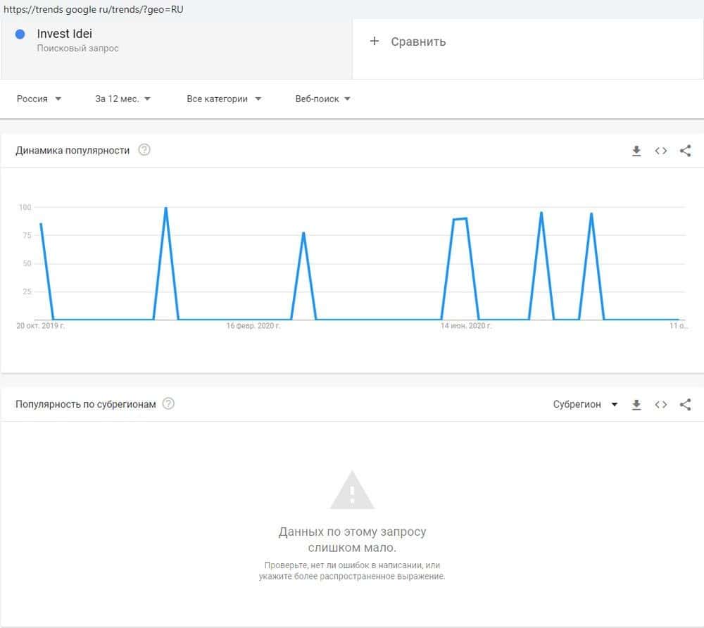 Запрос "Invest Idei", который ближе именно к названию мошеннической шараги, мало кого интересует. На просторах сети полно подобных лохотронов и люди относятся к ним с опаской.