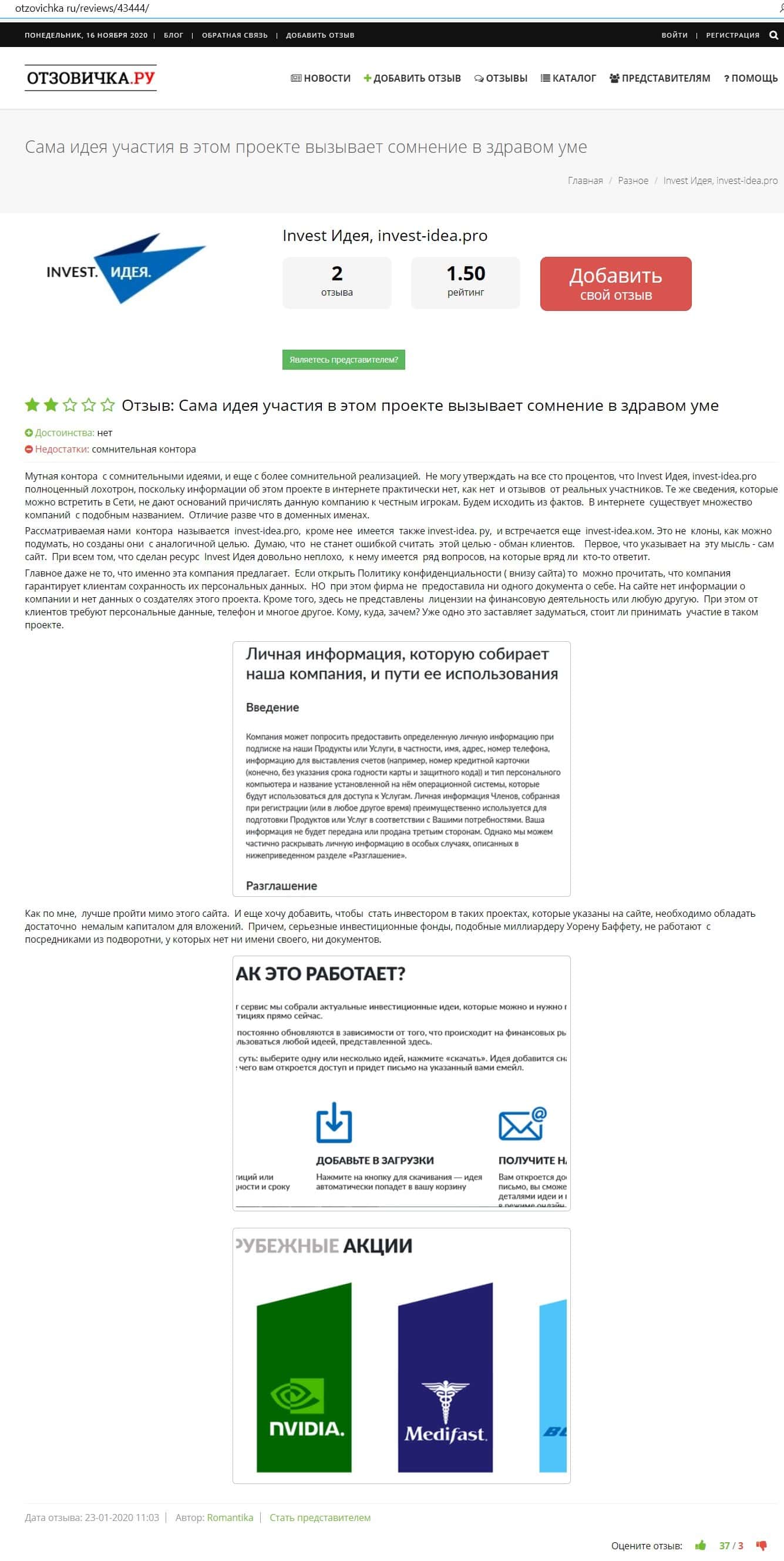 Отзыв на сайте otzovichka ru рассказывает о том, что компания Инвест Идея - крайне сомнительный и мутный проект, чему нашлось много подтверждений.
