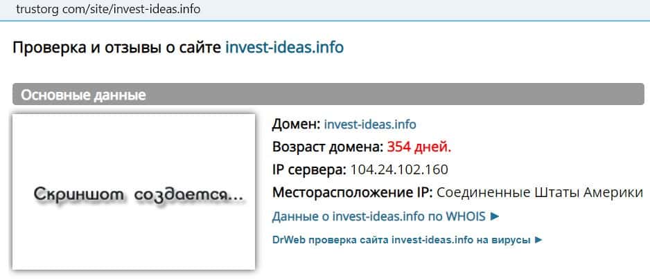 Возраст доменного имени сайта составляет invest-ideas info равен 354 дня. Такое время существует данная псевдоинвестиционная компания.