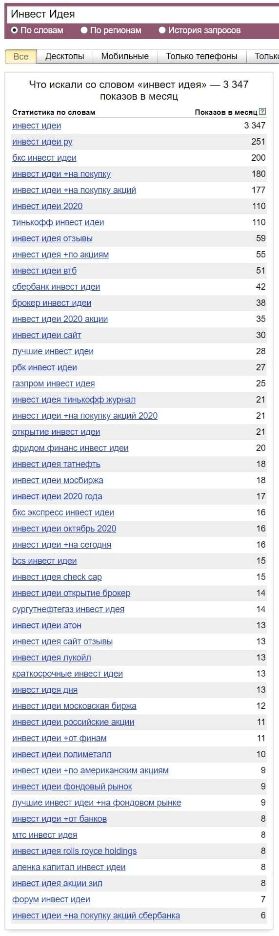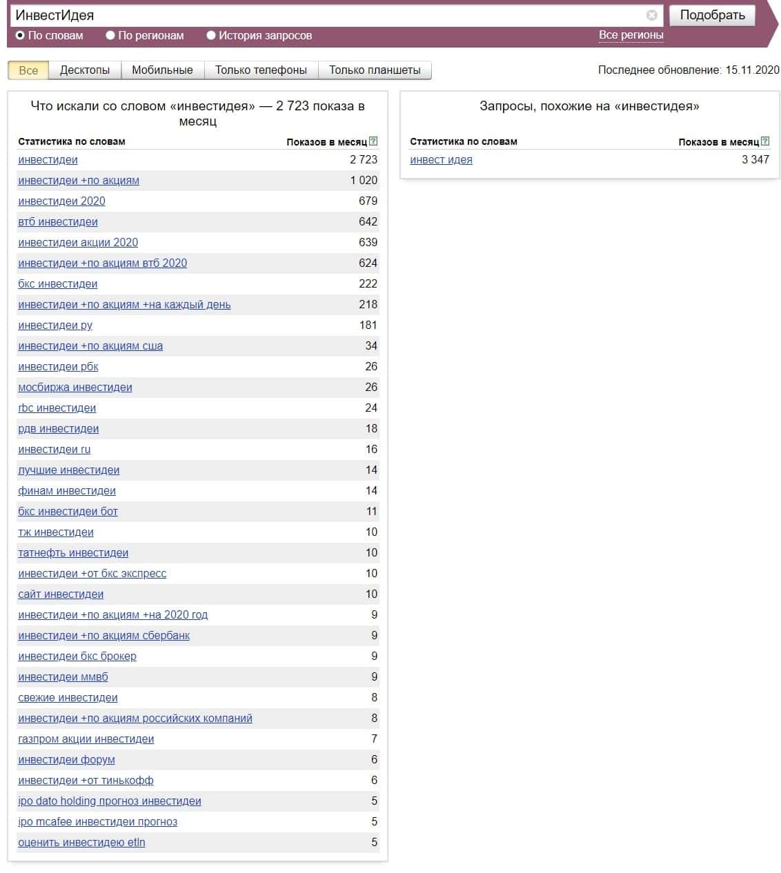 То же название, но написанное с пробелом "Инвест Идея", люди пытались найти в системе Яндекс с таким результатом: 3347 показов в месяц.