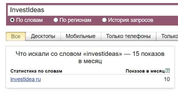- Количество брендовых запросов в поисковике Яндекс Вордстат по Инвест Идея