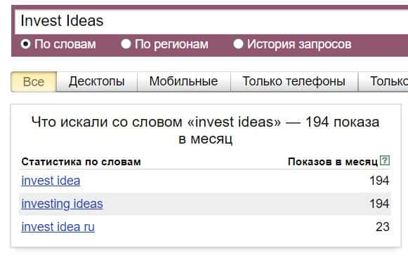 Проверка по названию бренда на английском языке с пробелом "Invest Ideas" дала следующий результат: 194 показа.