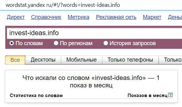 Количество запросов по домену "invest-ideas.info" с точкой, совершенных пользователями в сервисе Яндекс, равняется 1 показу. Практически нулевая активность пользователей.