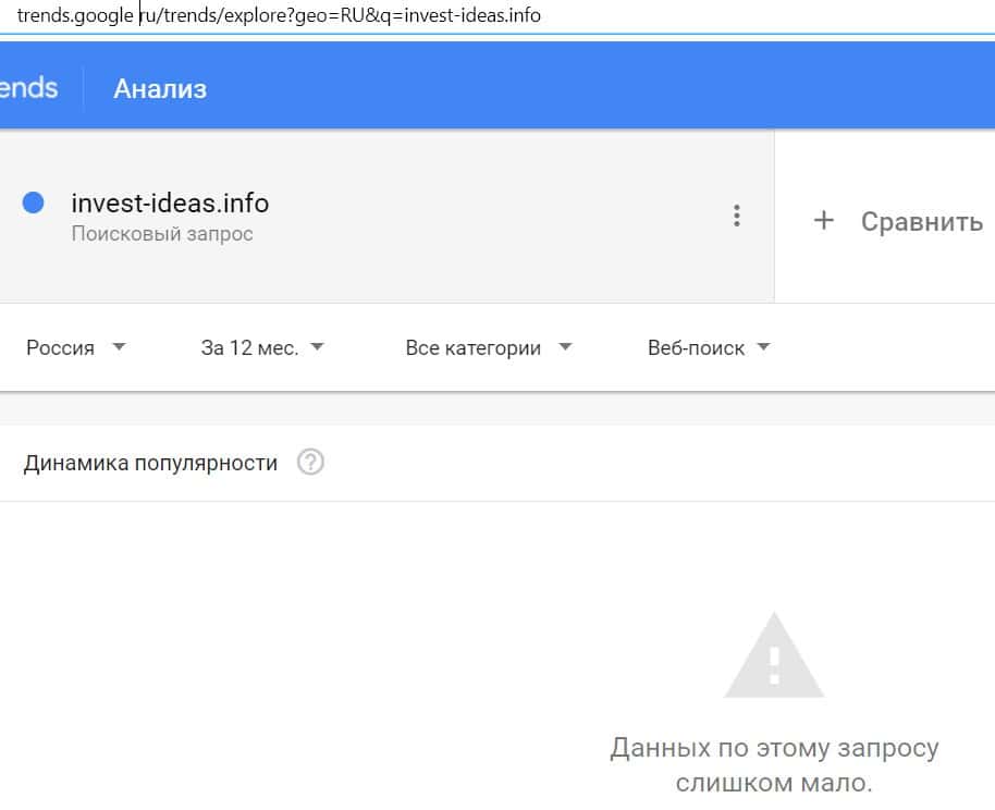 Судя по данным сервиса Гугл Тренд, доменное имя "invest-ideas.info" с точкой искали в поисковой системе крайне редко.