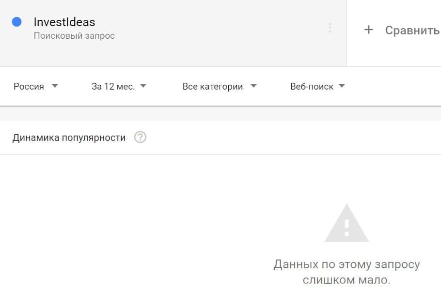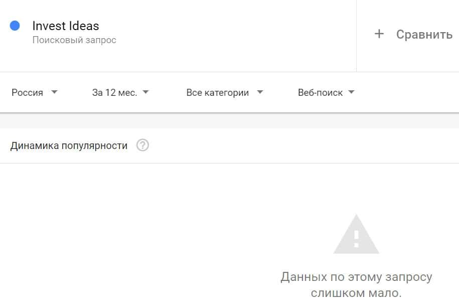 Проверка по названию бренда на английском языке с пробелом "Invest Ideas" дала следующий результат: компанию искали крайне редко.