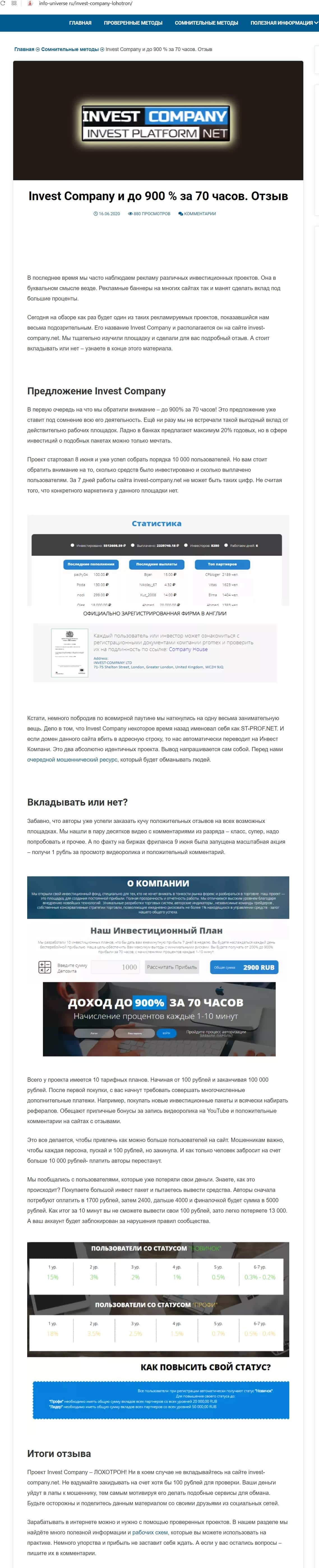 Сайт Инфоюниверс написал разоблачительную статью про мошенников из конторы Инвест Компани, где говорит, что у них нереально высокий процент прибыли и сказочные условия.