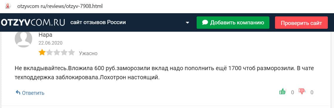 Нара пишет в своем отзыве, как мошенники из Инвест Компани разводили ее на деньги. Она вложила 600 рублей, но они просят добавить еще 1700, чтобы разморозить ее вклад.