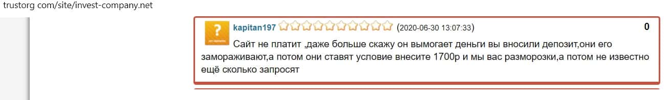 Пользователь написал комментарий негативного содержания, что контора Инвест Компани не платит. Мало того, они еще и вымогают деньги с клиентов, замораживая их счета.