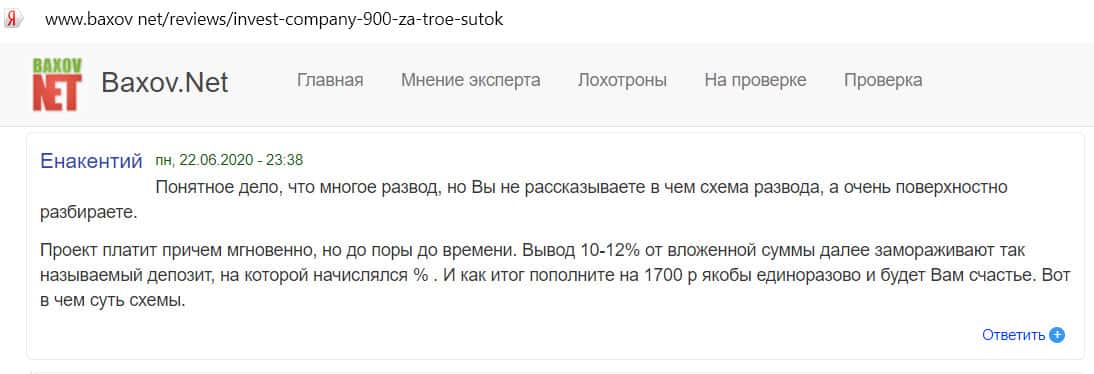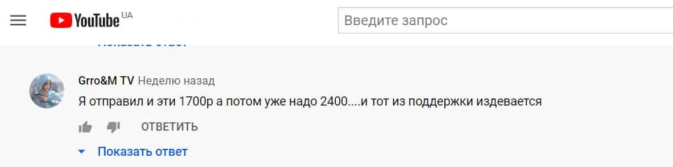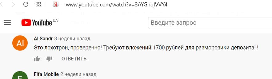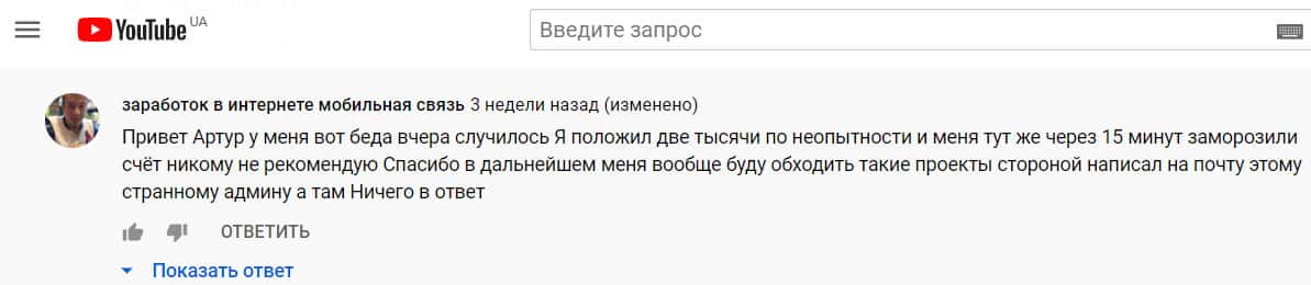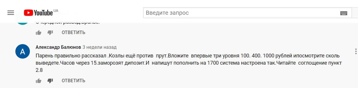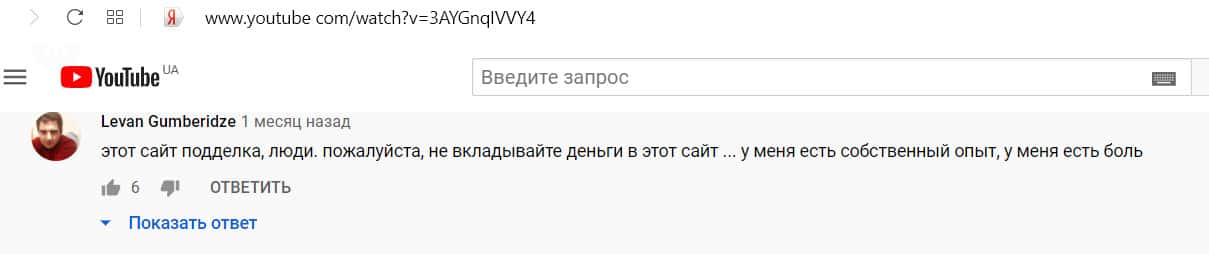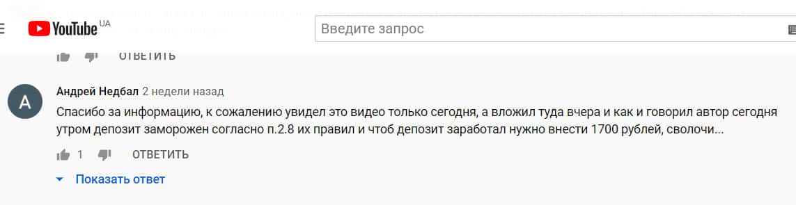 Еще один отзыв под видео сообщает о том, что шарага Инвест Компани - полная афера. Автор отзыва уже работал с ней и у него остался плачевный опыт.