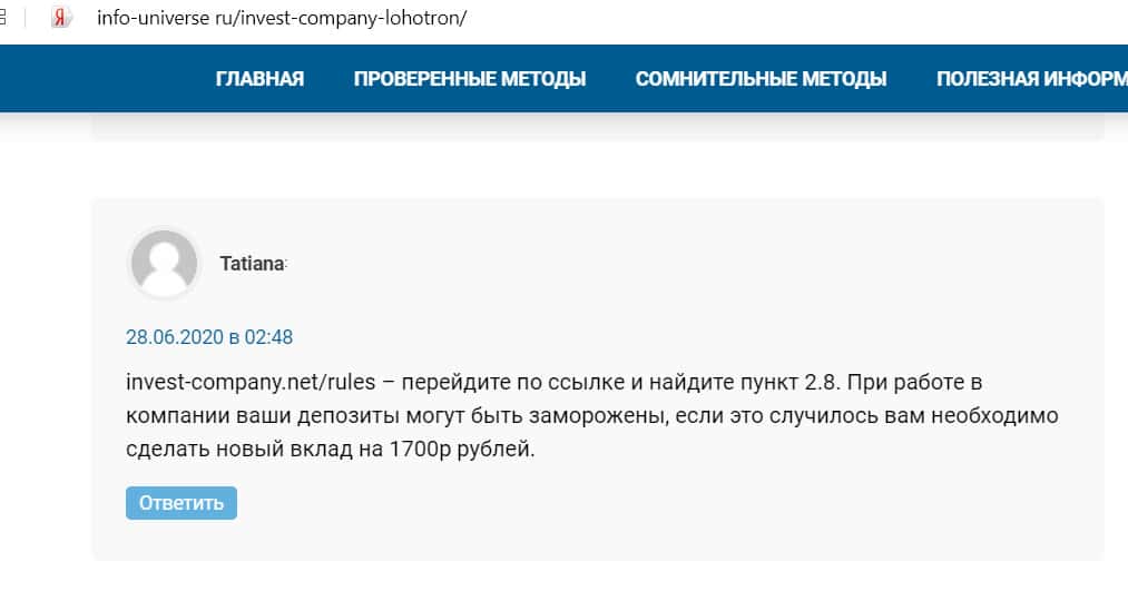 Татьяна заметила, что у компании Инвест Компани шулерские правила и дала ссылку на них. В правилах указано, что, если ваш депозит заморозят, вы должны внести 1700 рублей.
