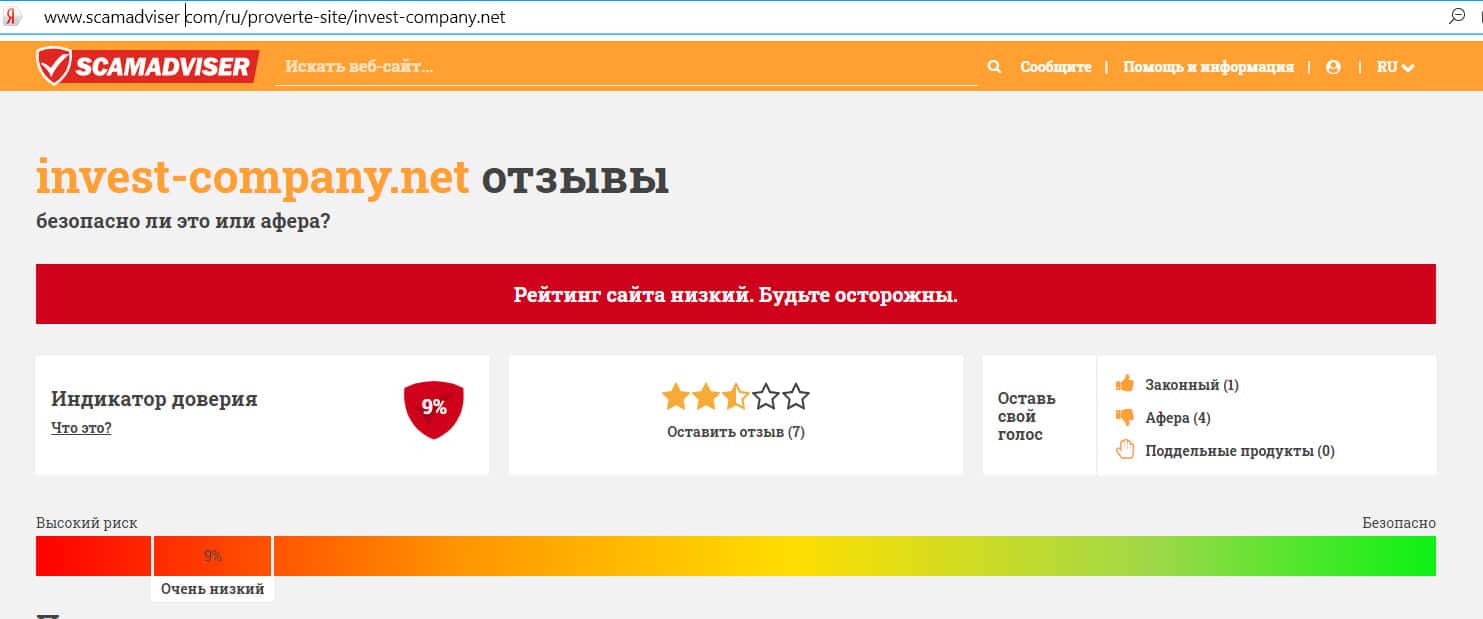 Проверка сайта invest-company net на сервисе Скамадвайзер показала, что у данного ресурса очень низкий рейтинг доверия. Таких контор надо опасаться.