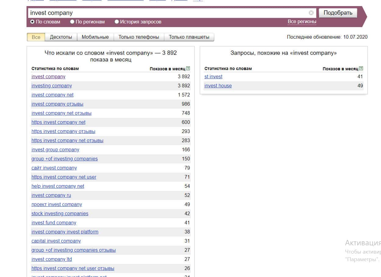 Название бренда "investcompany", вбитое в поисковик Яндекс, на английском языке без пробелов, было показано всего 10 раз за месяц.