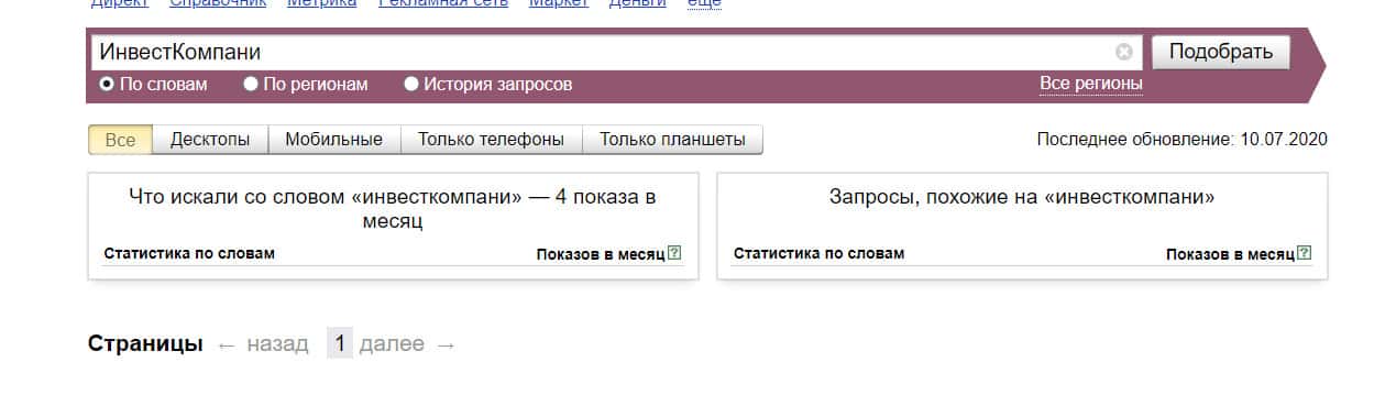 Если набирать в поисковой системе Яндекс название компании "Инвест Компани" на русском языке, мы видим следующие показатели: 750 раз в месяц.