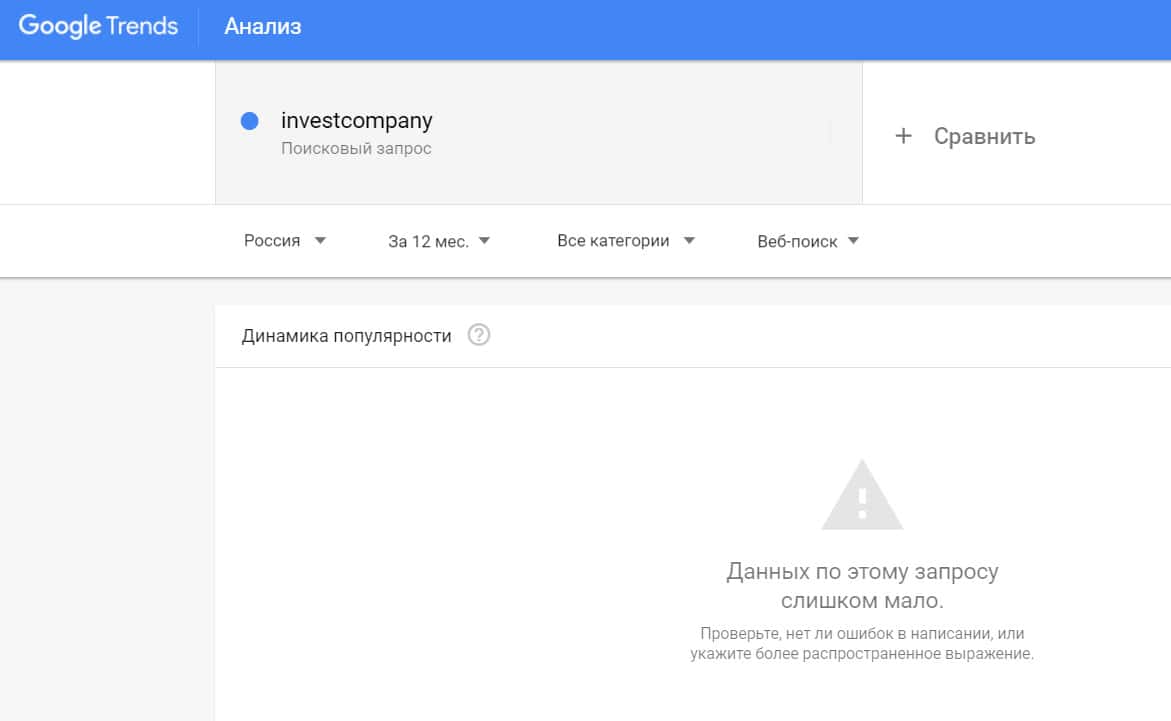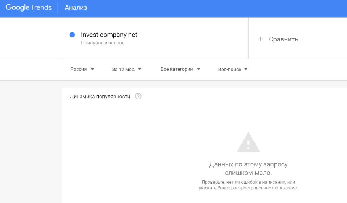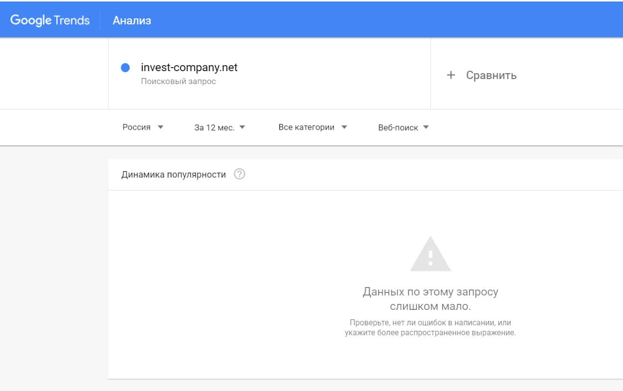В поисковике Гугл мошенническая организация "invest company" не пользуется особой популярностью, так как данных о количестве брендовых запросов слишком мало.