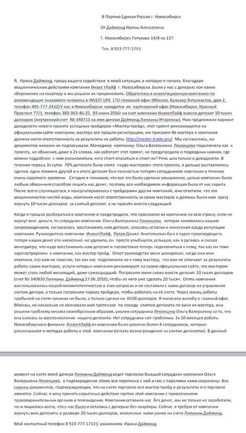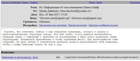 А это скриншот первоначальной жалобы на мошенническую кухню Инвест Лайф, которая пришла к нам в редакцию.