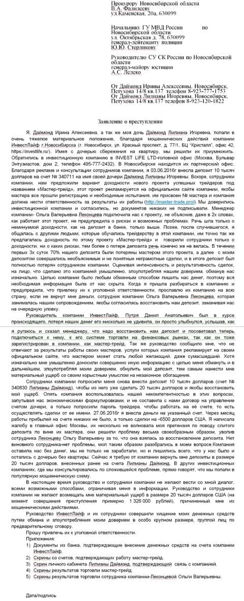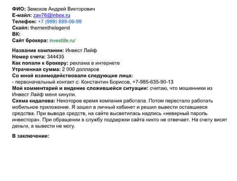 История от очередного заявителя очень запутанная, в ней фигурирует брокер Инвест Лайф, суть же проста, как обычно развели лоха, у которого были на руках деньги. Предложили вложить, дальше деньги слили, и предложили вложить опять и так в 2 этапа деньги у заявителя кончились. Более подробно суть ситуации описывается в заявление в прокуратуру.
