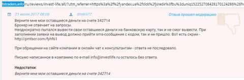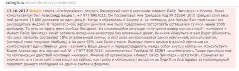 Инвест Лайф как обычный forex-лохотрон в конце-концов прекратит выплачивать денежные средства своим клиентам. Потому как абсолютно любая финансовая кухня, коем и является дилинговый центр Invest Life на рынок выходит лишь для того, чтобы заработать с помощью мошеннической деятельности, направленной на обворовывание любителей поспекулировать на рынке Форекс. Ниже предлагаю реальные примеры не вывода клиентских денег из данного онлайн-лохотрона в отзывах, которые были оставлены в глобальной сети теми, кто повелся на различного рода заманухи со стороны аферистов в лице брокера Инвест Лайф.