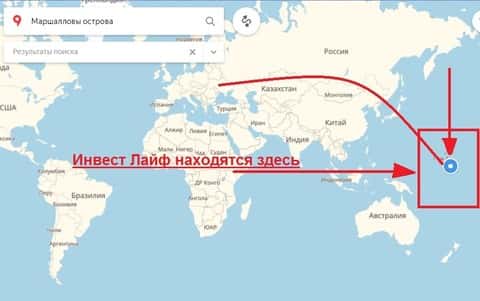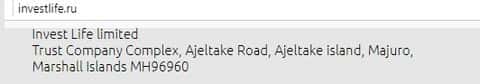 Что касается реального места нахождения этого жульнического ДЦ, то оно у них расположилось в офшорной зоне. Брокерская компания Invest Life забралась аж на Маршалловы острова - в это государство на сегодняшний день является одним из излюбленных мест разных forex-мошенников.