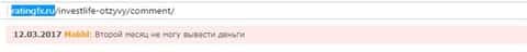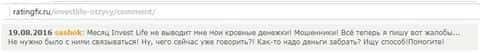 Далее еще один трейдер, который связался с мошенниками в лице дилингового центра Invest Life, пишет о том, что уже месяц как не может забрать свои деньги у этого брокера.