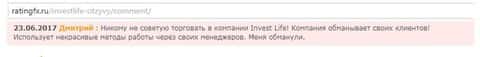 Комментарии о брокерских организациях внебиржевого рынка - основной источник информации, являющейся мнением пользователей всемирной паутины, которые скорее всего ранее обслуживались в той или иной forex-конторе. Так вот после того как был изучен весь имеющийся во всемирной паутине материал о компании Invest Life, можно смело заявить: дилинговый центр Инвест Лайф - обычная кухня, которая проплачивает позитив в свой адрес и конечно же следит за тем, чтобы неугодные для брокера отзывы были как можно быстрее удалены из публичного доступа.
