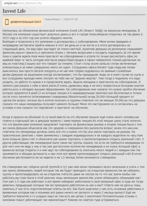 Здесь описан пример того, как мошенническая компания Инвест Лайф с помощью привлечения новых сотрудников в forex-лохотрон, заманивает к себе в финансовую кухню новых потенциальных жертв мошенничества.