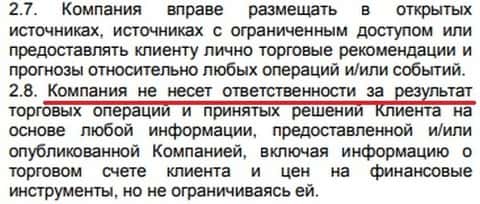 Дилинговый центр Invest Life прописал у себя в регламенте подставу в виде пункта 2.8 клиентского договора. Данная контора не будет нести ответственности за потери средств клиентами, которые воспользовались торговыми рекомендациями от сего кухонного ДЦ. Тем самым forex-организация Инвест Лайф подтверждает то, что ее аналитика скорее всего представляет собой информацию не соответствующую действительности.