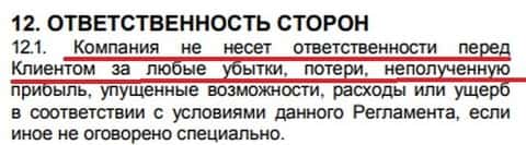 Как Вам дальнейшая мошенническая норма прописанная в регламенте форекс-брокера Invest Life, которая даст понять каждому, что этот дилинговый центр является типичным онлайн-лохотроном, потому как контора не несет абсолютно никакой ответственности перед клиентом за любые потери денег, а также за неполучение им прибыли.