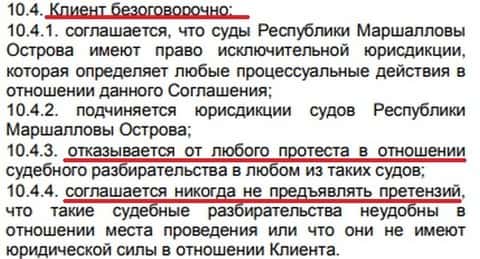 Если Вы стали очередным клиентом брокерской компании Инвест Лайф, можете забыть о том, что у Вас якобы есть право, при необходимости, предъявлять дилинговому центру претензию, либо обращаться в суды офшорного государства Маршалловы острова, потому как в разделе 10 данного договора имеются нормы, в соответствии с которыми, Вы соглашаетесь с тем, что с Invest Life разбираться при каких-либо обстоятельствах Вы не будете.