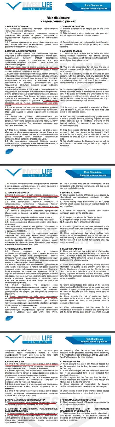Также не менее важным документом у брокеров Forex является уведомление о клиентских рисках. Ниже можно ознакомится с этим нормативно-правовым актом от мошеннической организации Инвест Лайф. Данный нормативно-правовой акт также был детально изучен, после чего были выделены наиболее примечательные фрагменты текста для тех, кто хочет увидеть различного рода подводные камни этого интернет-лохотрона, обворовывающего представителей веб-сообщества, которые проживают на территории СНГ.