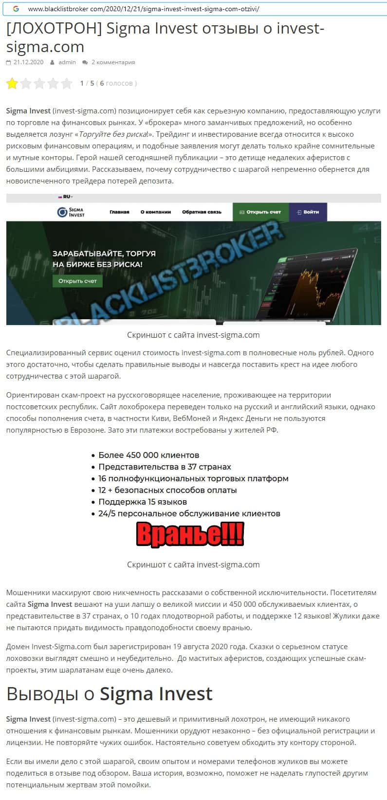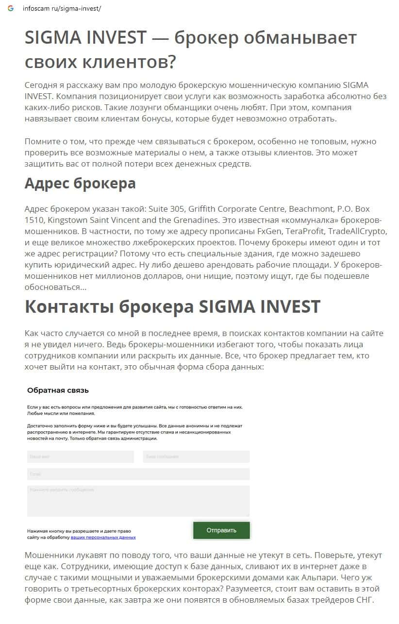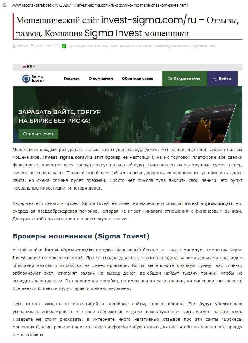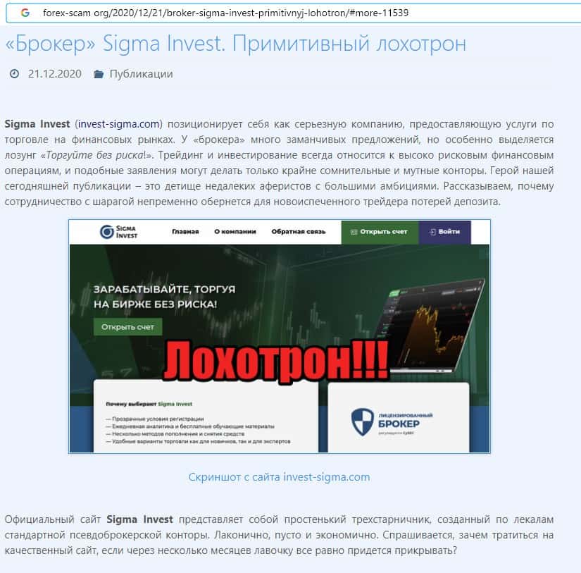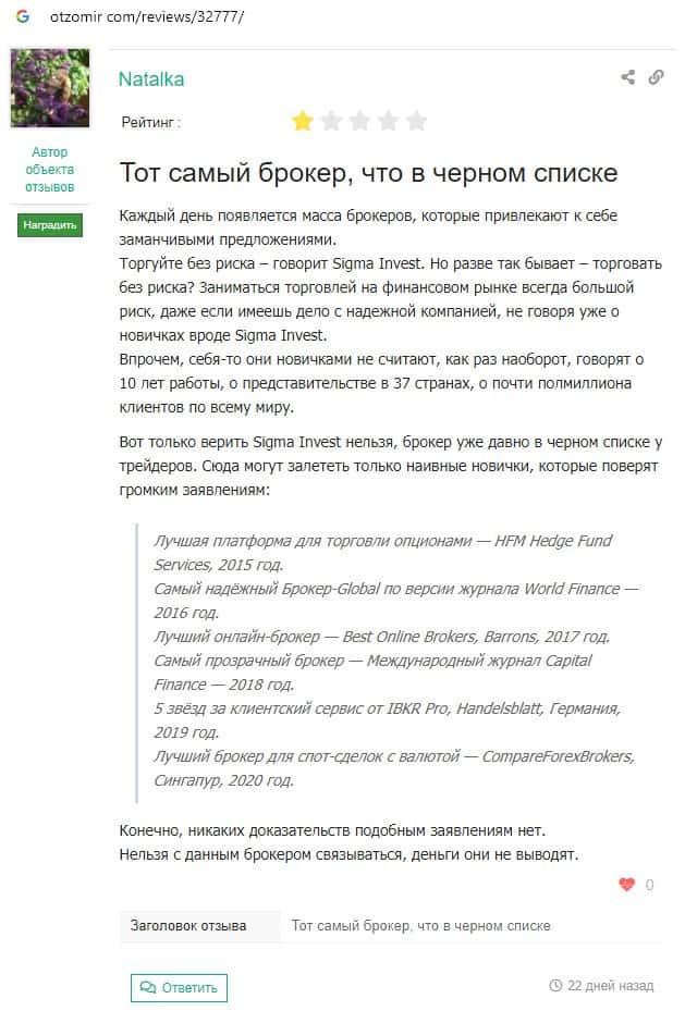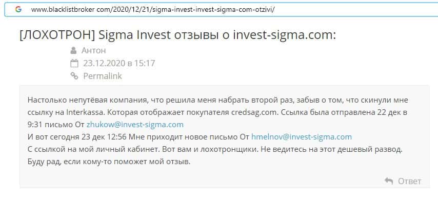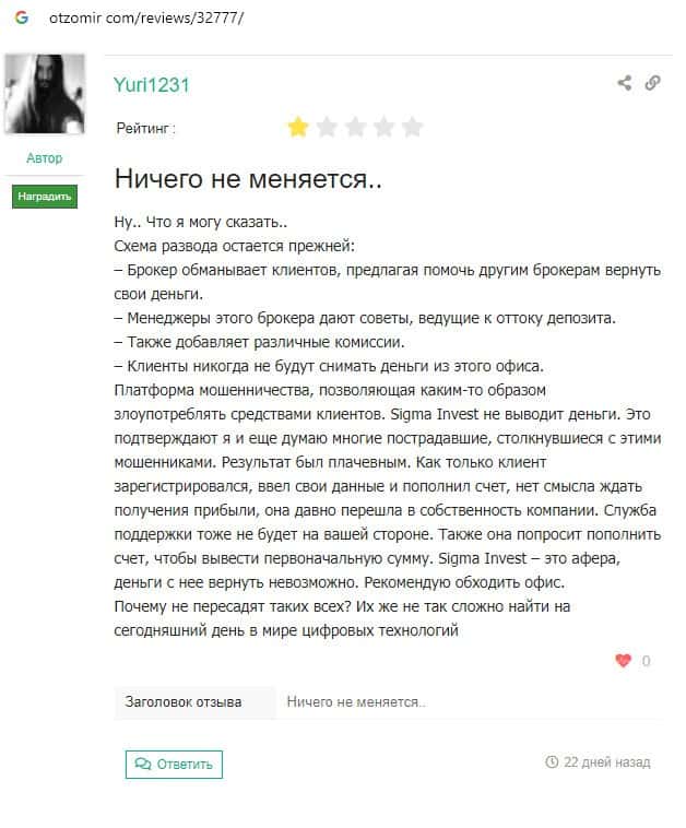 - Отзывы о скам-брокере Invest Sigma, ныне присутствующие в интернет-сети