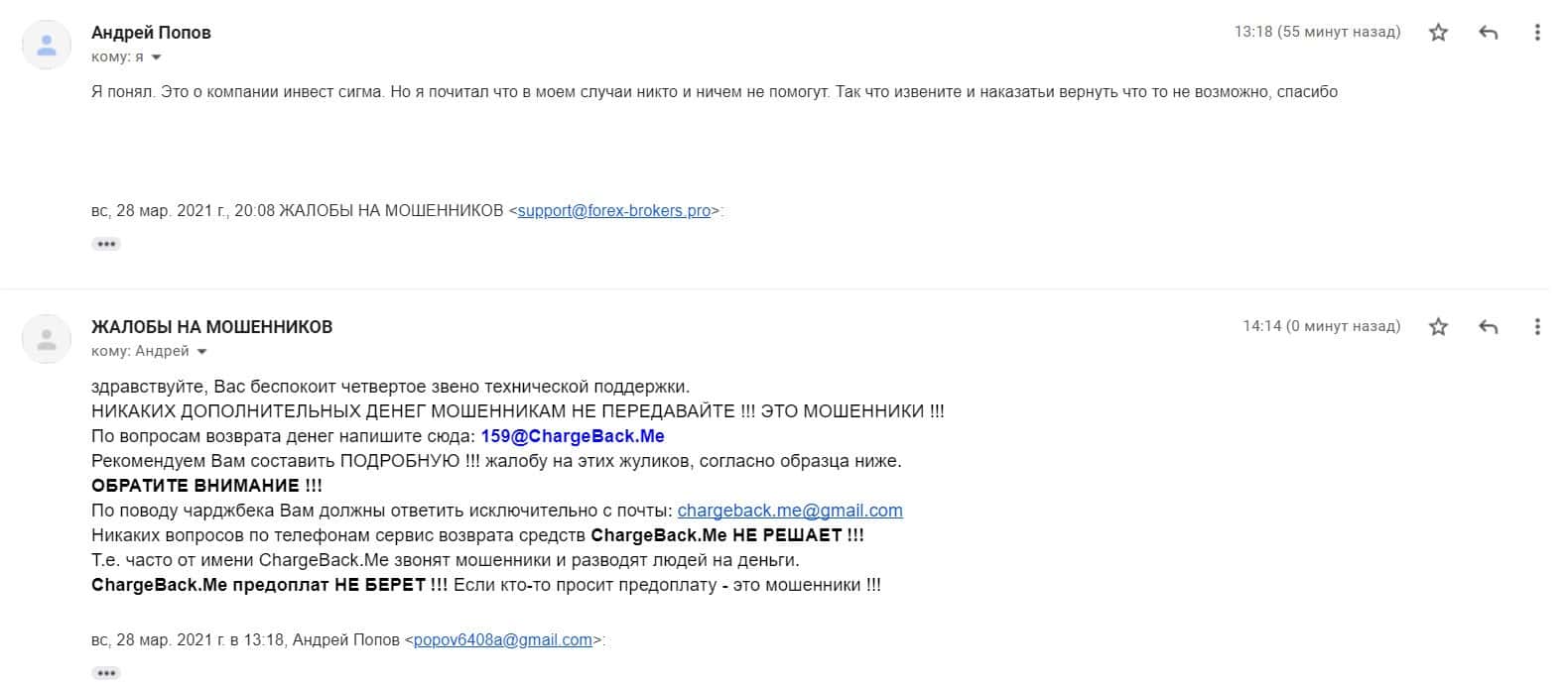 В данном разделе предлагаем увидеть жалобу на скам-контору Инвест Сигма от клиента, который потерял вероятно менее 1000 долларов, потому как чарджбек в его случае невозможен.