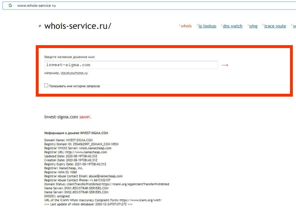 Сервис whois-service ru не может найти данные о владельце домена веб-портала мошеннической организации Invest Sigma, доверять сайту данной скам-конторы нельзя.
