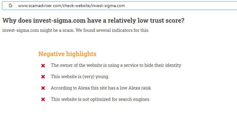 Проверка Invest Sigma на сайте scamadviser com показала, что у данного сайта низкий рейтинг, а также выявлено множество отрицательных моментов в работе сервера.