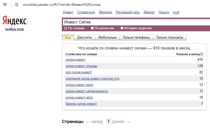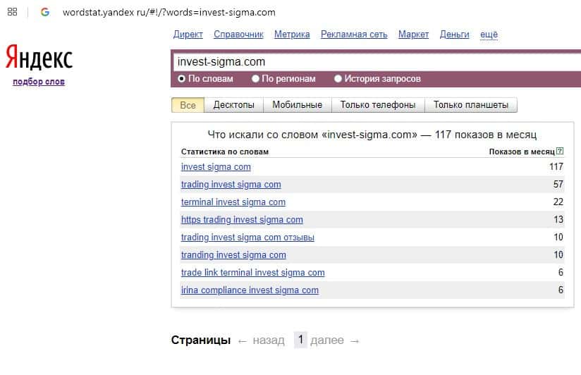 Количество брендовых запросов название домена компании "invest-sigma.com" на Вордстарт Яндекс Ру составляет 117 запросов за месяц.