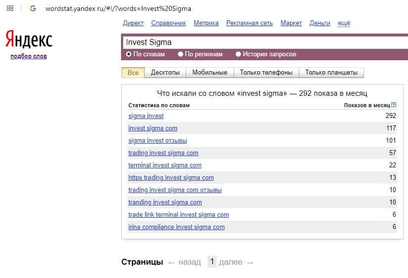 Количество запросов по бренду англоязычного названия компании "Invest Sigma" на wordstat yandex ru составляет 292 показа за месяц.