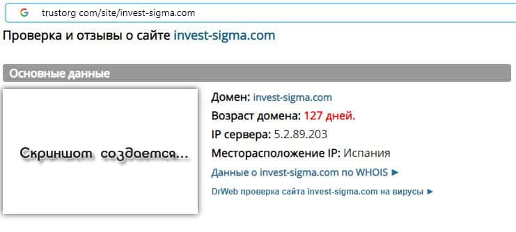 Проверка интернет-ресурса обманщиков Инвест Сигма на trustorg com показала, что возраст домена к моменту написания статьи составляет 127 дней, скорее всего домен купленный.