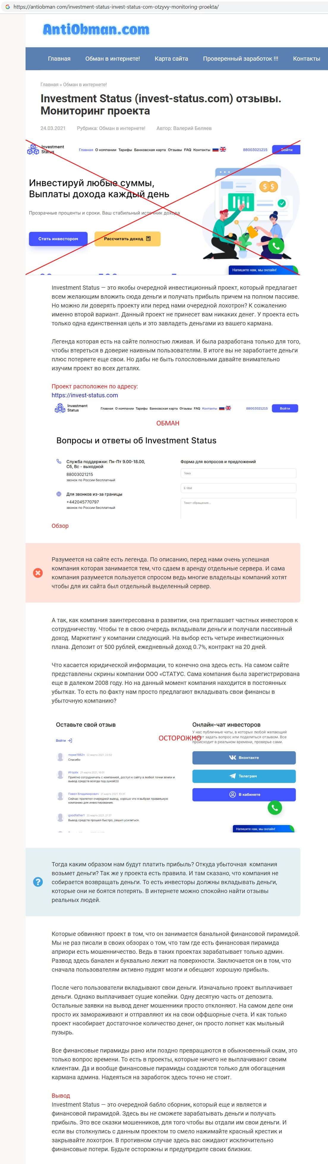 Так же интернет - ресурс antiobman com рассказал, что компания Инвест Статус является финансовой пирамидой, в которой пользователи смогут только потерять свои средства.