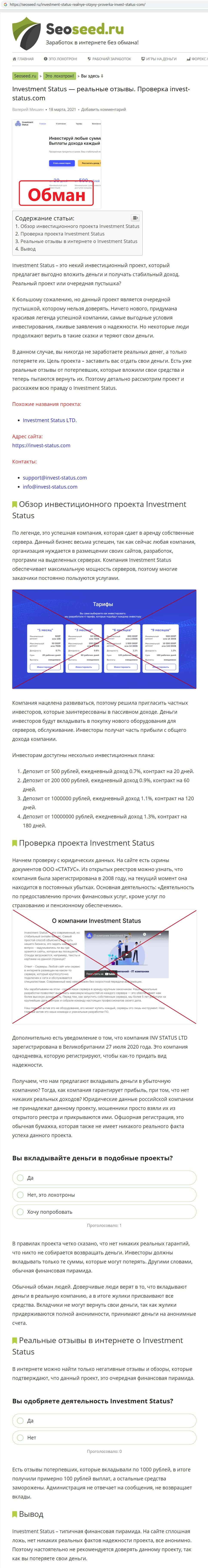 О компании Инвест Статус высказался и сайт seoseed ru, который указал, что фирма является пирамидой, а сайт компании наполнен фальшивой информацией.