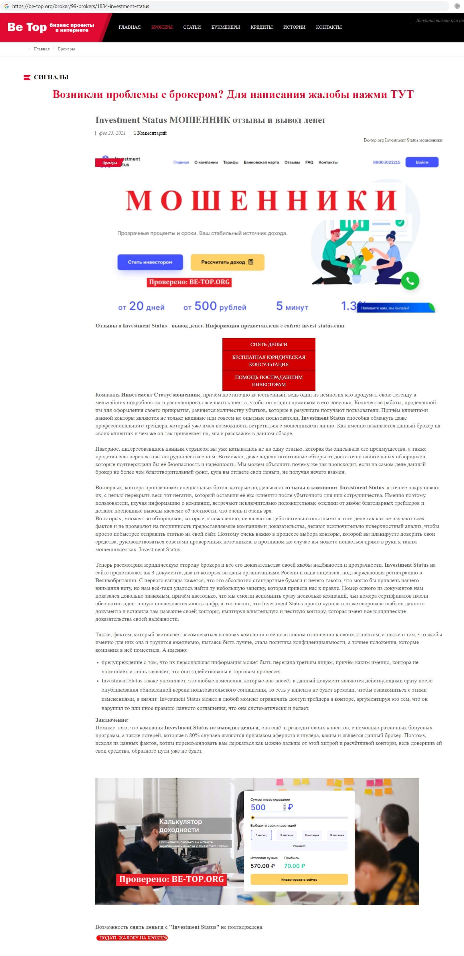 Ещё сайт be-top org опубликовал информацию о компании Инвест Статус, в которой сообщил, что данная фирма не выводит средства клиентов а только разводит их.