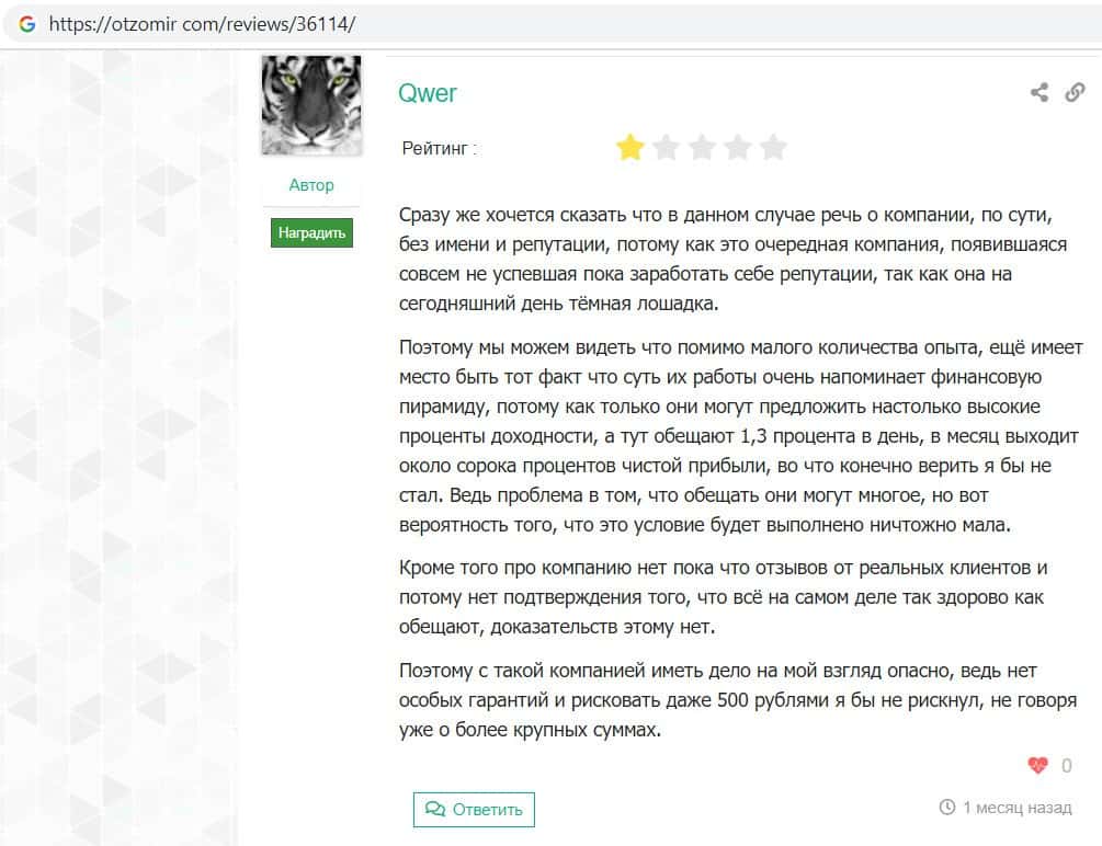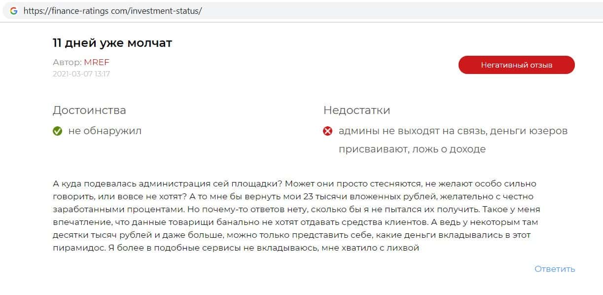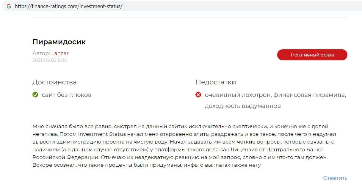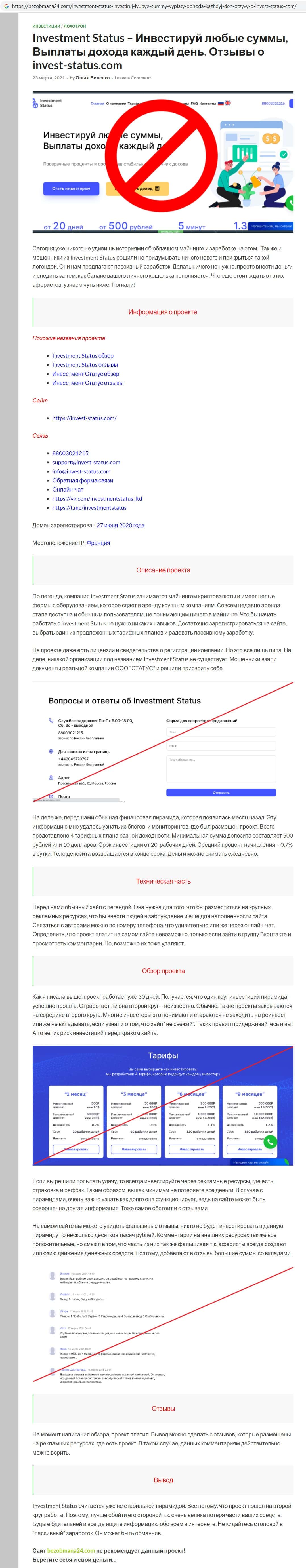 Так же компанию мошенников Инвест Статус не рекомендует и сайт bezobmana24 com, так как он считает её финансовой пирамидой, которая отнимает денежные средства клиентов.