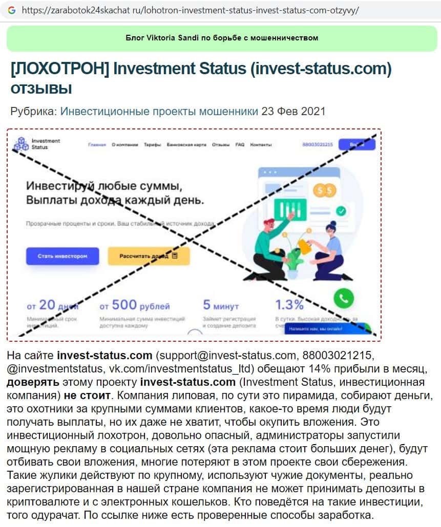 Так же своё слово о компании Invest Status высказал и сайт zarabotok24skachat ru, который указал, что компания является липовой со всеми признаками финансовой пирамиды.