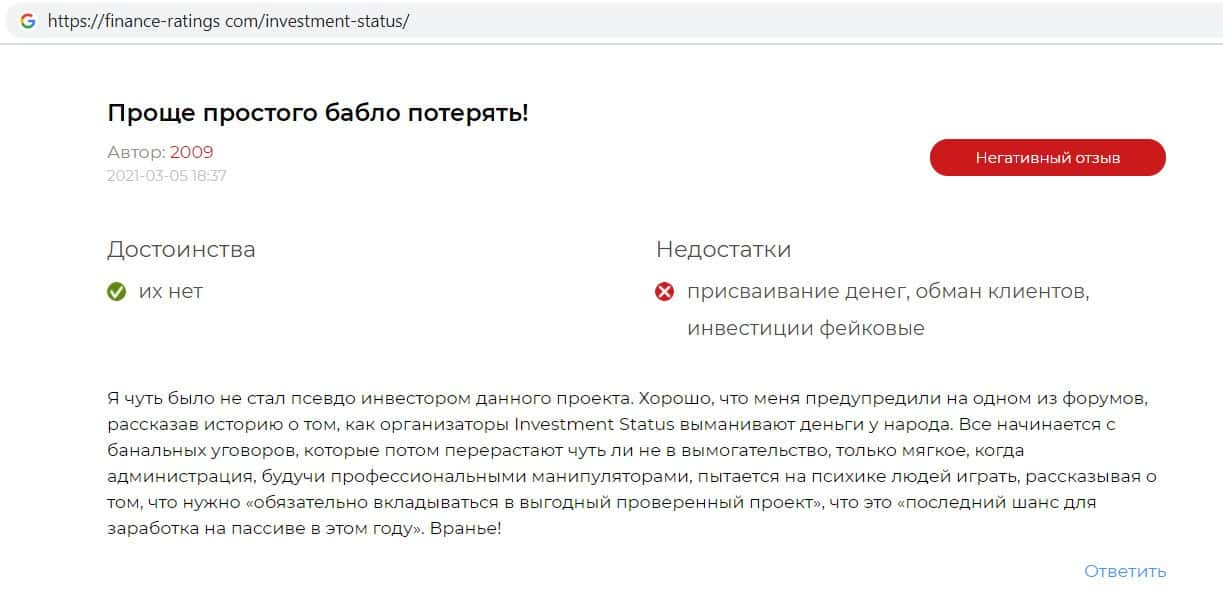 Автор данного отзыва написал, что компания Invest Status является кидаловом и разводиловом, так как в сети много информации подтверждающей её мошенничество.