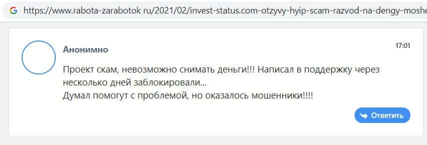 В данном отзыве пользователь сообщи, что не смог вывести средства из компанииInvest Status, после чего написал в поддержку, но жулики просто заблокировали его аккаунт.