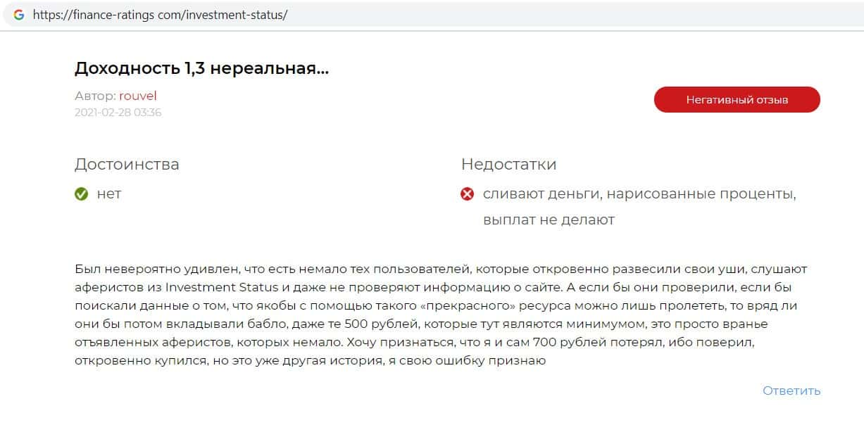 Автор этого отзыва написал, что чуть не попался на уловки лохотрона Инвест Статус, но его вовремя предупредили пользователи на форумах о том, что фирма является мошенником.