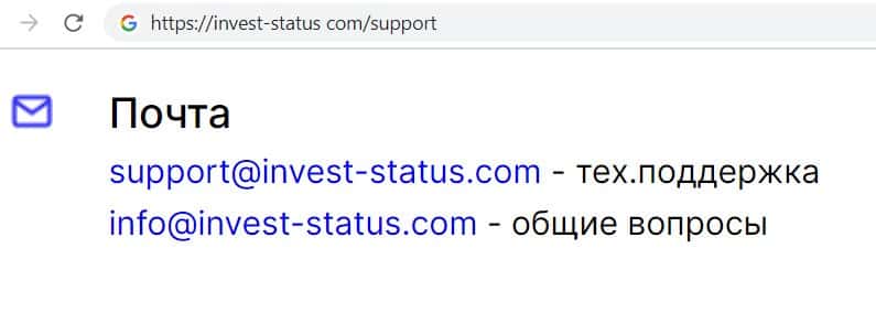 Так же в качестве контактных данных фирма жуликов Invest Status представила адреса электронной почты, где поддержка кидал выманивает средства у клиентов. Почта аферистов: