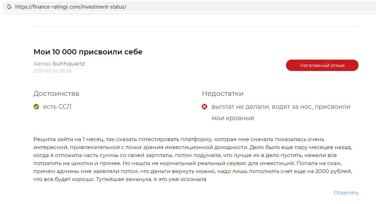 Ещё один пользователь написал, что инвестировал часть своей зарплаты в Инвест Статус, но когда решил вывести, фирма сказала, что нужно внести ещё 2000 рублей для вывода.