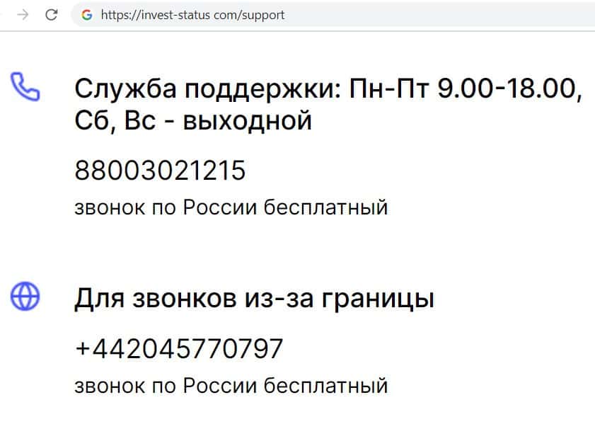 Махинаторы Invest Status на своём сайте указали номера телефонов, с которых сотрудники лохотрона звонят пользователям и заманивают их в финансовую ловушку. Номера мошенников: